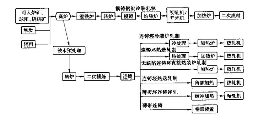長流程工藝,顧名思義,具有生產(chǎn)周期長、生產(chǎn)單元多,規(guī)模龐大等特征。大致工藝流程為:煉鐵原燃料入高爐冶煉得到液態(tài)鐵水,高爐鐵水經(jīng)鐵水預(yù)處理入氧氣轉(zhuǎn)爐吹煉,再經(jīng)二次精煉(或不經(jīng)過)獲得合格鋼水,鋼水經(jīng)過凝固成型工序(連鑄或模鑄)成坯或錠,再經(jīng)軋制工序成為合格鋼材。