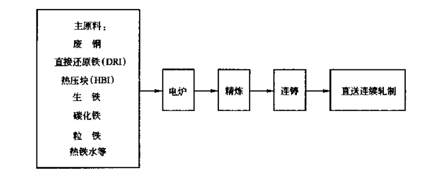 短流程工藝,具有工藝流程簡捷、高效節(jié)能、生產(chǎn)環(huán)節(jié)少、生產(chǎn)周期短等特征。大致工藝流程為:廢鋼破碎、分選加工,經(jīng)預(yù)熱直接加入電爐,電爐以電能為熱源進行冶煉,再經(jīng)二次精煉獲得合格鋼水,后續(xù)工序同長流程工序。